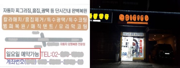 일요일 예약가능으로 명함을 만들어 영업하는 사업장(왼쪽)과 단속을 피해 야간에 불법도장을 하는 사업장 외부모습(오른쪽). (사진=서울시)