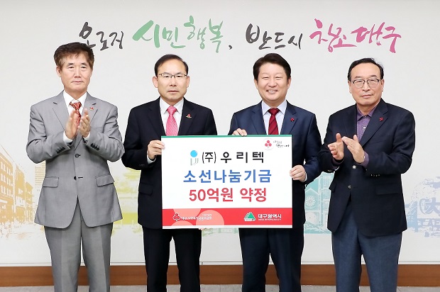 대구시 소재 사출금형 전문기업 ㈜우리텍이 11월 22일 오후 2시 대구시장실에서 소외 이웃지원과 나눔 문화 활성화를 위해 대구사회복지공동모금회에 역대 최고 기부액인 50억원을 기부하기로 약정했다.