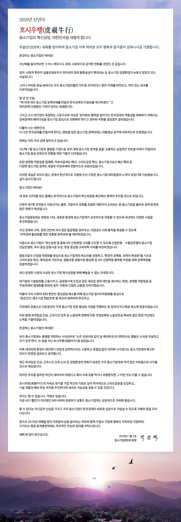박성택 중기중앙회장은 “중소기업인들이 2018년 한 해를 전망하는 사자성어로 ‘눈은 호랑이와 같이 늘 예리하게 유지하면서도 행동은 소처럼 착실하고 끈기 있게 한다는 뜻을 지닌 호시우행(虎視牛行)을 꼽았다”며 “이는 역대 최대치의 최저임금 인상과 근로시간 단축 논의 등 경영환경의 변화로 많은 어려움이 예상되지만, 위기를 기업혁신의 기회로 삼겠다는 의지가 반영된 것”이라고 밝혔다.