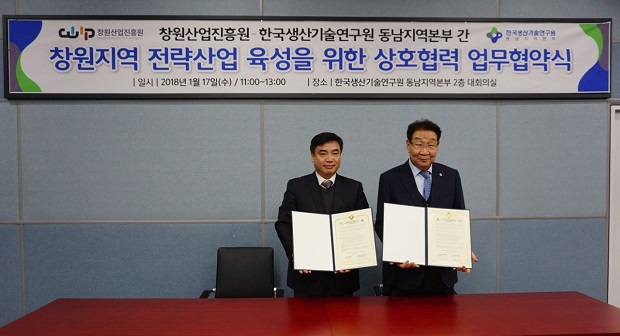 한국생산기술연구원(이하 생기원) 동남지역본부가 지난 17일 창원산업진흥원과 창원 지역 전략산업 육성 및 미래형 첨단 소재·부품산업 전문(희망) 기업 발굴을 위해 상호 간 협력 체계를 구축하는 협약을 체결했다.