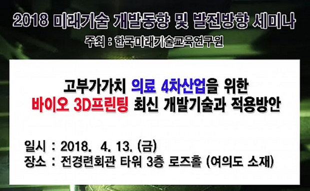 한국미래기술교육연구원(http://www.kecft.or.kr, 대표 박희정)은 오는 4월 13일 서울 여의도 전경련회관 로즈홀에서 '고부가가치 의료 4차산업을 위한 바이오 3D프린팅 최신 개발기술과 적용방안 세미나'를 개최한다고 밝혔다.