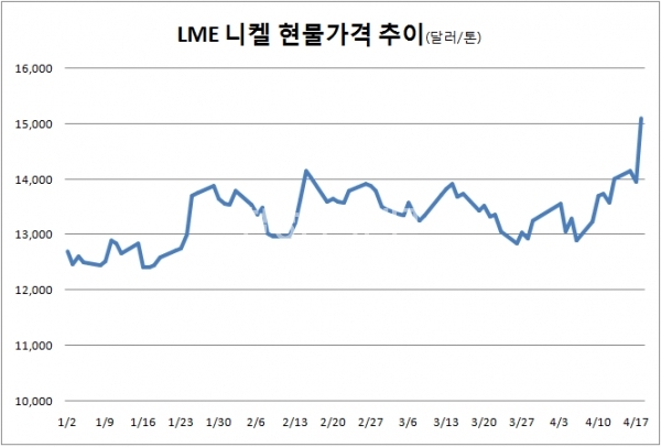지난 18일 런던금속거래소(LME)에서 거래된 니켈 현물가격은 전일대비 8.28%인 1,155달러가 오르면서 톤당 1만5,105달러를 기록했다. 이는 지난 2015년 2월 9일 기록한 톤당 15,170달러 이후 약 3년여래 가장 높은 가격이다.