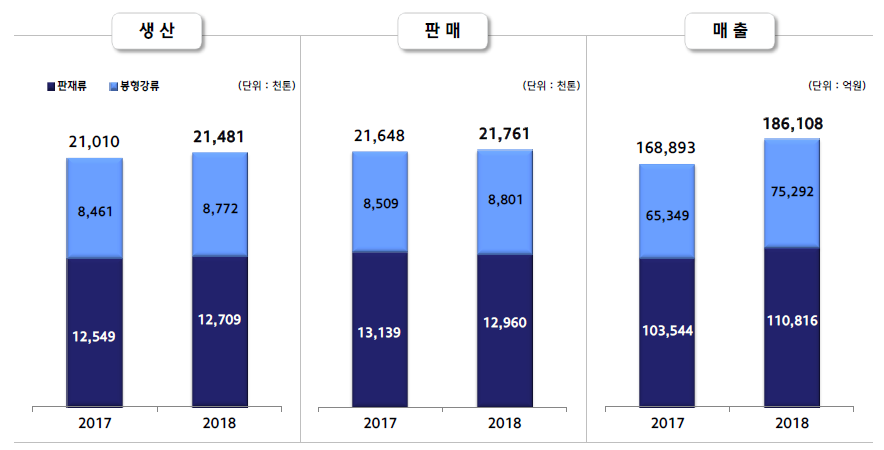 2018년 판매량은 2,176만1,000톤을 기록, 전년 2,164만8,000톤에 비해 0.5% 증가했다. 판재류 판매는 1,296만톤, 봉형강류는 880만1,000톤을 보였다.