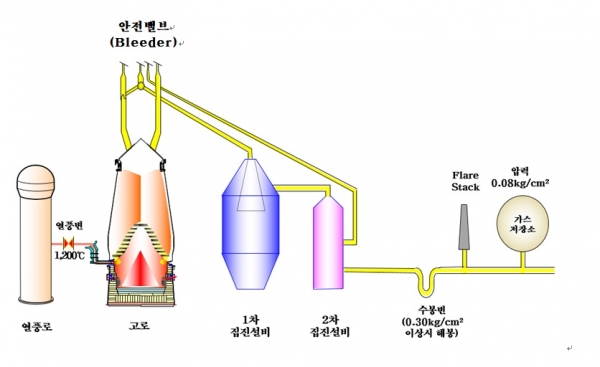 따라서 이를 예방하기 위해 고로 내부에 스팀(수증기)을 주입해 외부 공기 유입을 차단하고, 이 때 주입된 스팀과 잔류가스의 안전한 배출을 위해 고로 상단에 있는 안전밸브(“블리더”)를 개방하게 된다.