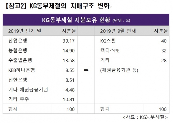 KG스틸이 지분 40%를 보유한 1대 주주로, 캑터스PE가 지분 32%를 보유한 2대 주주로 각각 올라섰다. 산업은행 등 채권금융기관 보유 지분 합계는 약 27%로 줄어들었다. 재무구조도 획기적으로 개선됐다.