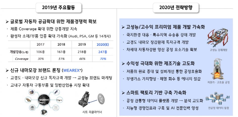 한편 현대제철은 2019년 글로벌 자동차 공급확대를 위해 소재·부품 개발과 제품 브랜드화를 통한 고객 마케팅을 강화한 바 있다. 실제 Audi, PSA, GM  등 14개사 완성차의 소재·부품 인증을 확대했다.