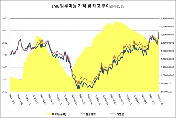 한편, 12월 LME 알루미늄 평균 가격은 톤당 2,022.8달러, 3개월물은 톤당 2,035.9달러로 전월 대비 90.7달러, 90.4달러 각각 상승했다.