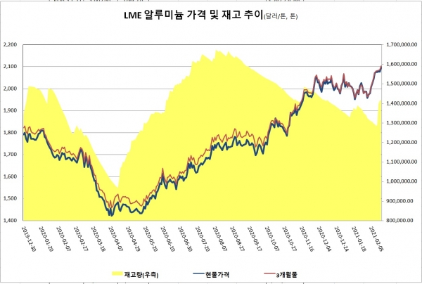 한편, 2월 LME 알루미늄 평균 가격은 톤당 2,034.5달러로 전월 대비 30.7달러 상승했고, 3개월물은 톤당 2,038.4달러로 33.3달러 올랐다.