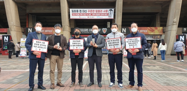 이날 협회회장단은 경기관전에 참가하는 시민에게 1회용컵 사용을 자제하고, 개인용컵 사용을 권장하는 뜻에서 스테인레스 텀블러 500개를 구입해 스틸야드 입구에서 나눠 주면서 1회용품 사용을 줄여 탄소저감 실천 생활화를 권장했다.