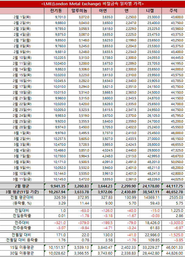 지난 11일 런던금속거래소(LME)에서 거래된 비철금속 현물 오피셜 가격(런던 오전 2nd ring 거래 기준)은 전기동이 톤당 1먼145달러(+1), 알루미늄 3,472달러(-63), 아연 3,835달러(-126), 연 2,361달러(-79), 주석 4만4,025달러(+1,225)를 각각 기록했다. 니켈은 이날도 거래 중단이 이어졌다.