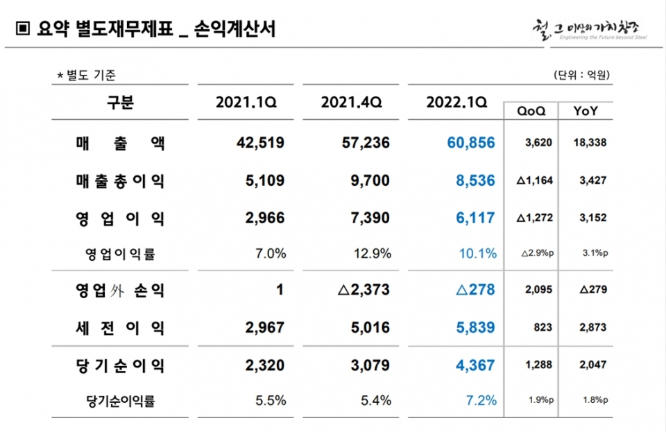 키워드 #재무제표 #현대제철 #별도 #영업이익 #매출액 #실적 #IR 박진철 기자 jcpark@snmnews.com 다른 기사 보기 관련기사 (현대제철IR) 연결 기준 재무제표(표) (현대제철IR) 1분기 판매·매출액 증가 (현대제철IR) "열연·철근價, 글로벌 철강수급 견조세로 강세 지속" (현대제철IR) "자동차 경량화 위한 고성능 철강소재 개발 박차" (현대제철IR) 현대제철, 1분기 영업이익 6,974억원 (현대제철IR) 물량 확보·수익성 강화 두 마리 토끼 잡았다 (현대제철IR) 구조 개편으로 사업 경쟁력 강화 저작권자 © 철강금속신문 무단전재 및 재배포 금지
