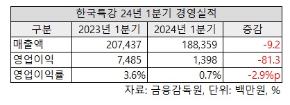 이에 따라 올 1분기 한국특강 영업이익률은 0.7%로 전년 동기(3.6%) 대비 2.9% 포인트(p) 하락한 것으로 나타났다. 연이은 건설경기 침체 속 제품 수요 감소에도 가동률을 끌어올리면서 매출 감소를 최소화한 모습이다.