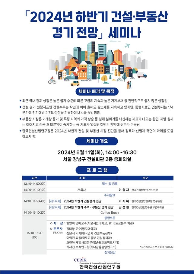 한국건설산업연구원이 6월 11일 오후 2시 서울 강남구 건설회관 2층 중회의실에서 '2024년 하반기 건설·부동산 경기 전망 세미나'를 개최한다고 30일 밝혔다.