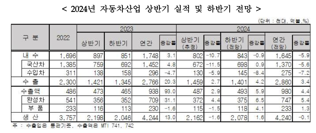24일 KAMA가 발표한 '2024년 자동차산업 상반기 동향 및 하반기 전망' 보고서에 따르면 우리나라 자동차 수출은 주요 시장의 견조한 성장으로 전년 동기 대비 4.2% 증가한 140만 대를 기록할 것으로 예상됐다. 금액 기준으로는 전기차, 하이브리드 및 스포츠유틸리티차(SUV) 수출 확대로 작년 같은 기간보다 6.5% 증액된 375억 달러(약 51조 9,450억 원)로 추정했다.