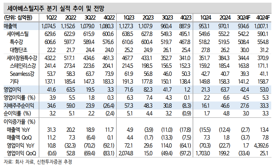현재 세아베스틸의 주가 밸류에이션은 PER(주가수익비율) 5배, PBR(주가순자산비율) 0.35배로 큰 폭의 이익 감소가 나타났던 2022년 수준으로 회귀한 것으로 평가된다. 신한투자증권은 폭발적인 이익 증가 모멘텀(계기)은 부재하나 예상 배당수익률이 6%에 달하기 때문에 주가 급락 가능성은 적다고 판단했다.