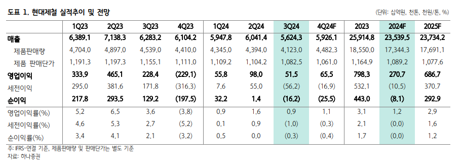 박성봉 하나증권 연구원은 이날 현대제철 기업분석('험난한 길!')을 통해 "올해 3분기 연결 매출액은 전년 동기 대비 10.5% 감소한 5조6,000억원을 기록했다"며 "특히 영업이익은 77.5% 급감한 515억원에 그치며 시장 컨센서스(961억원)를 크게 하회했다"고 전했다.