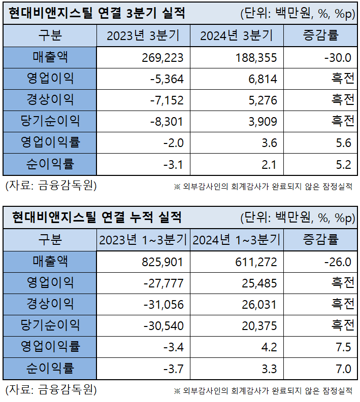 현대비앤지스틸은 3분기 연결 잠정 실적으로 영업이익 68억 1,400만 원, 당기순이익 39억 900만 원을 달성했다고 밝혔다. 전년 동기 53억 6,400만 원 적자, 83억 100만 원 적자에서 모두 흑자 전환하는 데 성공했다.
