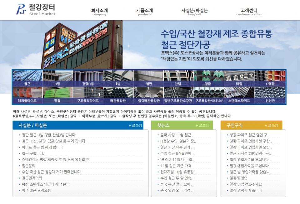 철강장터는 철강 유통업 20년 경력 정연이 이사장이 직접 포엑스와 함께 운영 중이다. 포엑스는 인천광역시 서구 백범로에 위치한 종합 철강 유통사로 인천항 보세창고에서 하치장을 운영하고 있다.