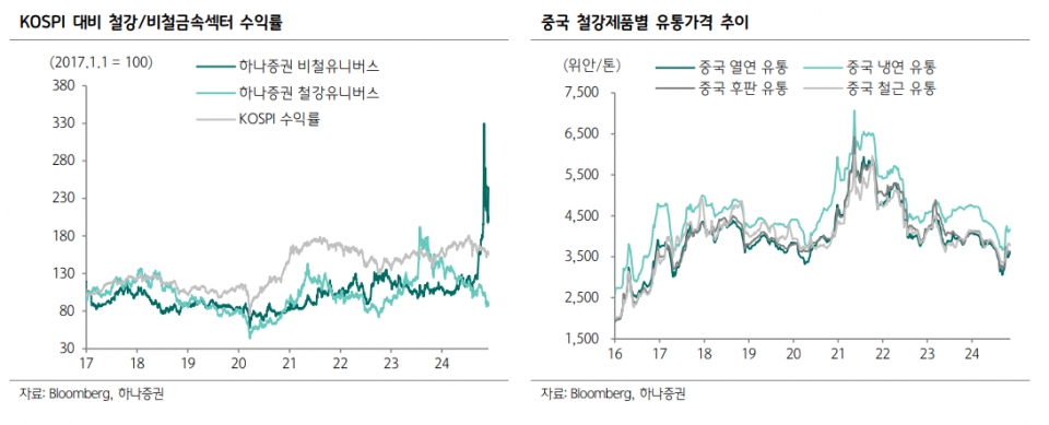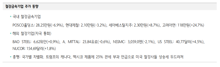 박성봉 연구원은 국내 철강금속주의 경우 최근 포스코와 현대제철이 일부 하락세를, 세아베스틸지주와 고려아연은 상승세를 기록했다고 전하며 중국 바오우스틸이 소폭 상승, 유럽 아로셀로미탈이 소폭 인하했고, 미국의 US스틸과 뉴코어 등 미국 철강사들은 주가 상승세를 보였다고 설명했다. 박 연구원은 “트럼프의 캐나다, 멕시코 제품에 25% 관세 부과 언급으로 미국 철강사들 상승세 두드러졌다”라며 “국가별 차별화가 나타난 것”이라고 평가했다.