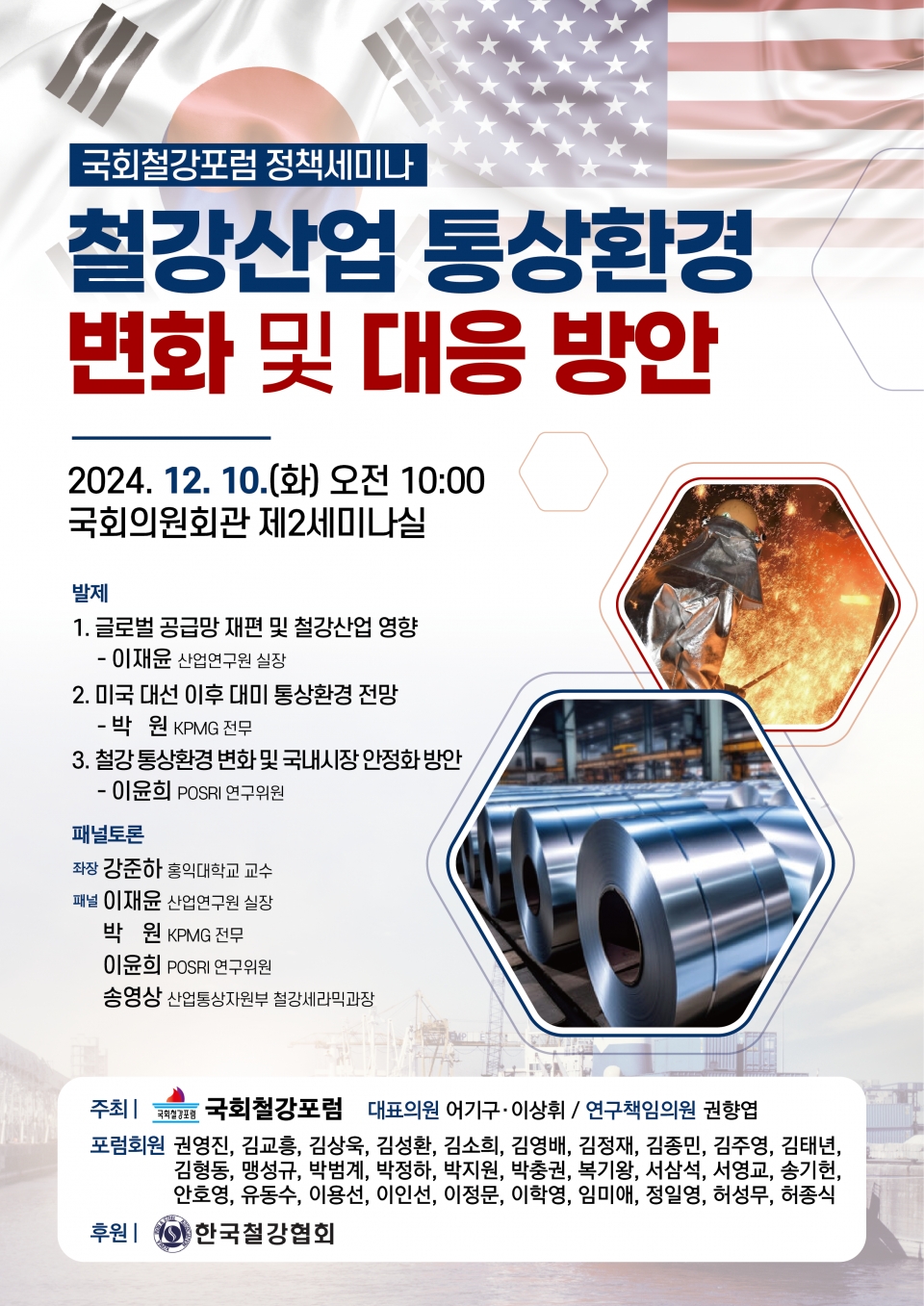 이날 행사에선 전문가 발표로 산업연구원 이재윤 실장이 ‘글로벌 공급망 재편 및 철강산업 영향’을 주제로 최근 철강업계의 수출입 상황을 설명했다. 이어서 KPMG의 박원 전무가 ‘미국 대선 이후 대미 통상환경 전망’을, 포스코경영원구원(POSRI)의 이윤희 연구위원이 ‘철강 통상환경 변화 및 국내시장 안정화 방안’을 주제로 향후 철강 통상의 핵심 이슈를 미리 짚어보고 국내 철강업계가 취해야 할 대응 방안에 대해 의견을 냈다.