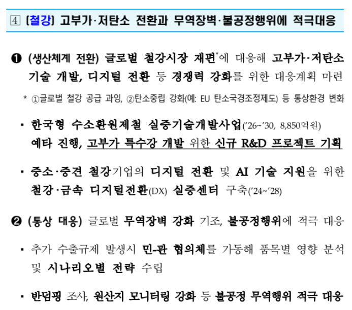 정부가 2025년 경제정책방향을 발표하며 민생경제 회복과 대외신인도 관리, 통상환경 불확실성, 산업경쟁력 강화에 나서겠다고 밝혔다. 산업경쟁력 강화 부문에서 철강업