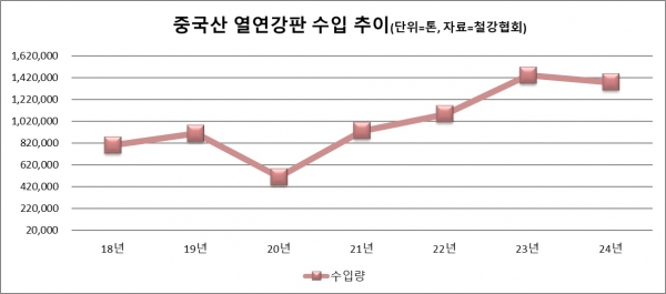 열연강판 수입은 2020년 일시적으로 감소했으나 2021년부터 다시 증가하는 추세를 보이고 있다. 2020년의 경우 팬데믹 초기 물류 대란과 국가별 봉쇄 등으로 제품 수입이 감소한 바 있다. 최근 중국산 열연강판 수입은 급증하고 있으며 지난 2023년에는 6년 만에 최대치인 144만 톤대를 나타냈다.