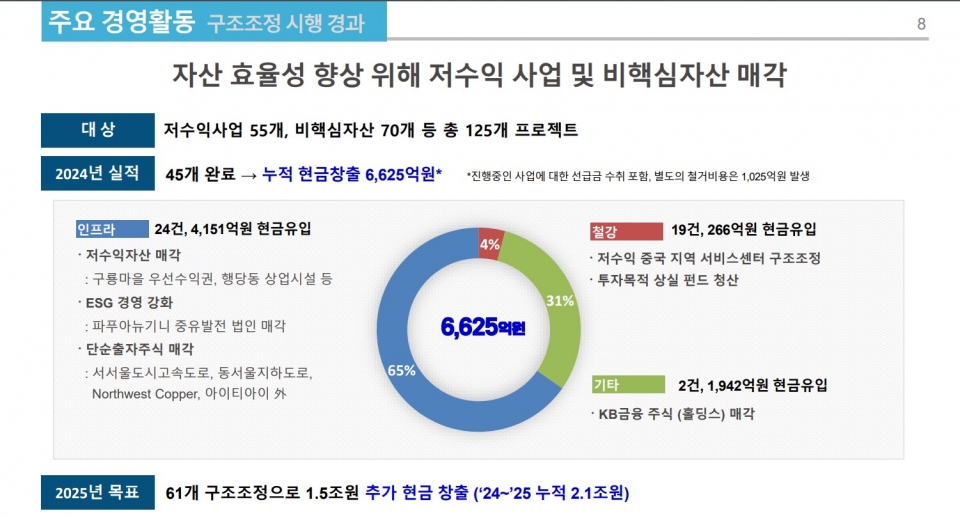 저수익 사업 55개와 비핵심자산 70개 등 총 125개 프로젝트를 대상으로 지난해 45개를 완료했다. 이에 누적 현금창출을 6,625억 원에 달했다. 세부내용으로는 철강의 경우 저수익 중국 지역 서비스센터 구조조정을 실시했으며 투자목적 상실 펀드를 청산했다. 이어 인프라부분은 저수익자산인 구룡마을 우선수익권과 행당동 상업시설을 매각했고 파푸아뉴기니 중유발전 법인 등을 매각했다.