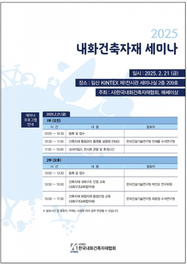 이번 세미나는 일산 킨텍스 제1전시관 세미나실 2층 209호에서 개최되며, 사전 예약을 통해 무료로 진행된다. 참석을 희망할 경우 한국내화건축자재협회 홈페이지에서 등록이 필요하다.
