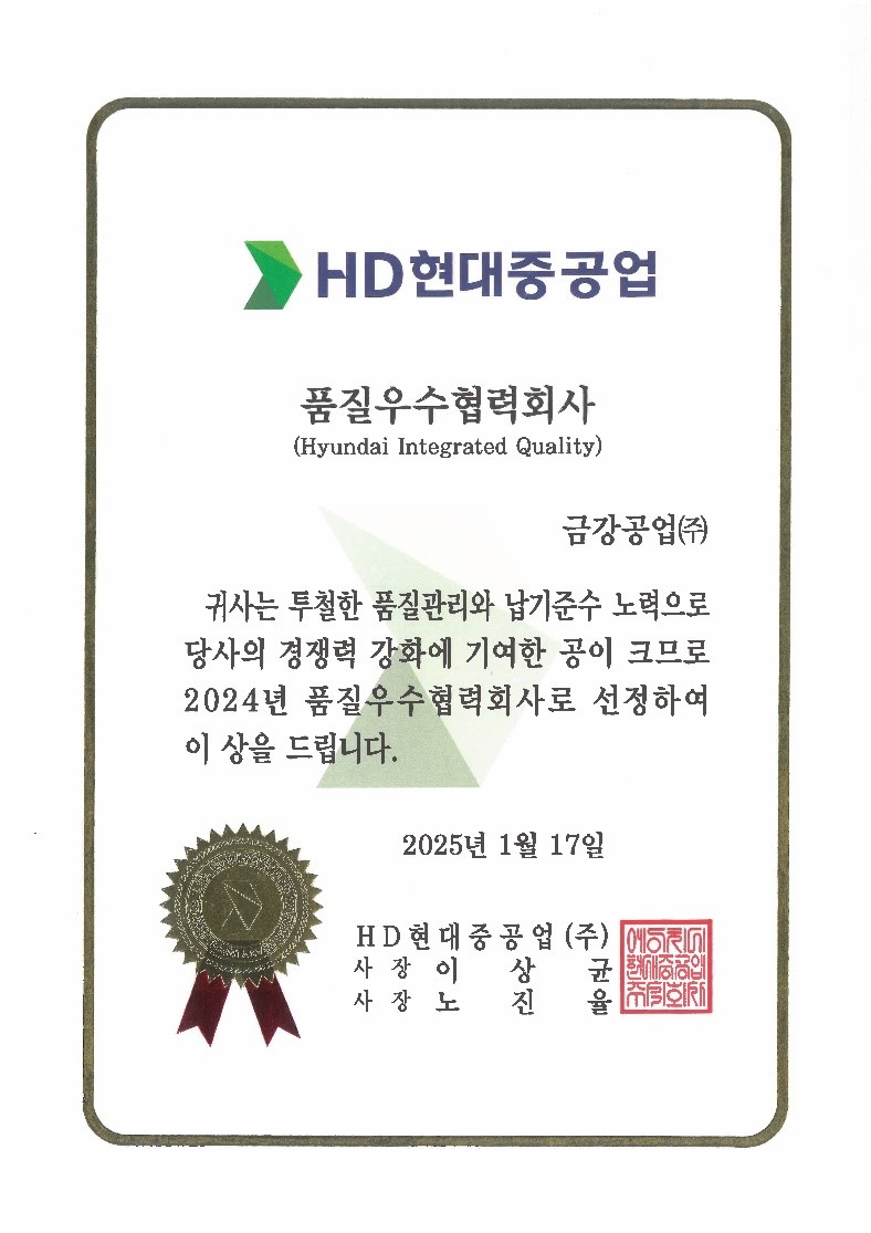 ‘2025년 HD현대 통합협의회 신년회’는 사업 계획과 미래 비전을 공유하고, 협력 강화 방안을 논의하는 자리로, 품질, 혁신, ESG(환경·사회·지배구조) 분야에서 우수한 성과를 거둔 65개 협력사를 선정하여 시상하는 시간을 가졌다. 금강공업은 그중 품질 우수 협력사로 인정받았다.