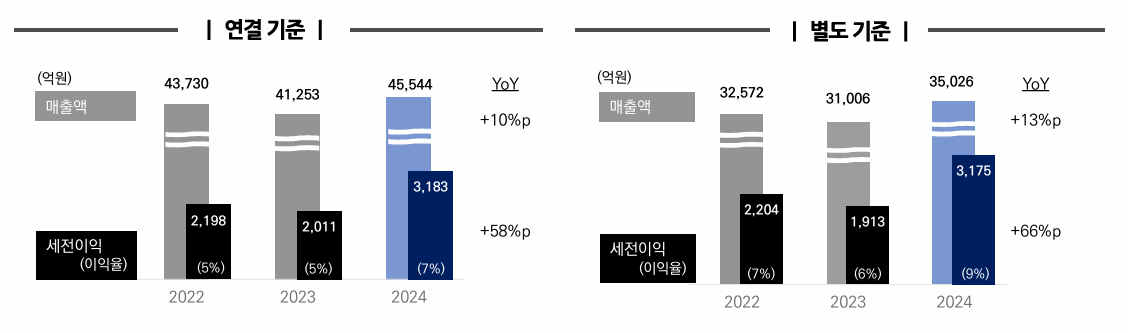 별도 기준 매출액은 9,803억원이라는 성과를 내며, 직전분기 대비 1,506억원, 전년 동기대비 997억원 증가했다. 세전이익 기준으로는 연결 기준 집계와 마찬가지로 54억원이 손실이 발생했다.