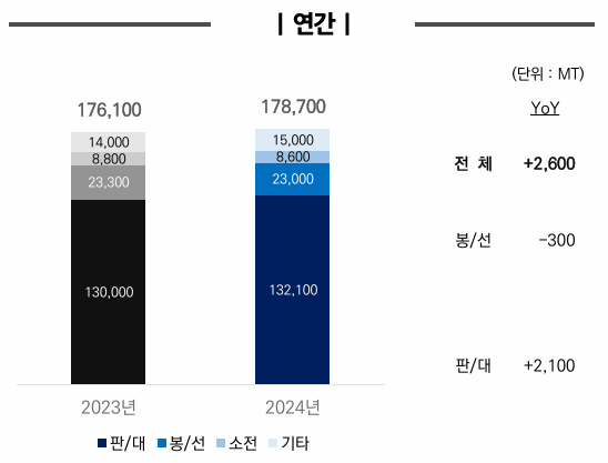 부문별로는 신동의 경우 지난해 총 17만8,700톤을 판매하며 전년대비 1%의 판매 성장을 이뤄냈다. 전년대비 2,600톤의 물량을 추가적으로 팔아치운 가운데, 봉/선 부문은 300톤 감소했으나 판/대 부문이 2,100톤 증가하며 총 판매 물량을 늘렸다.