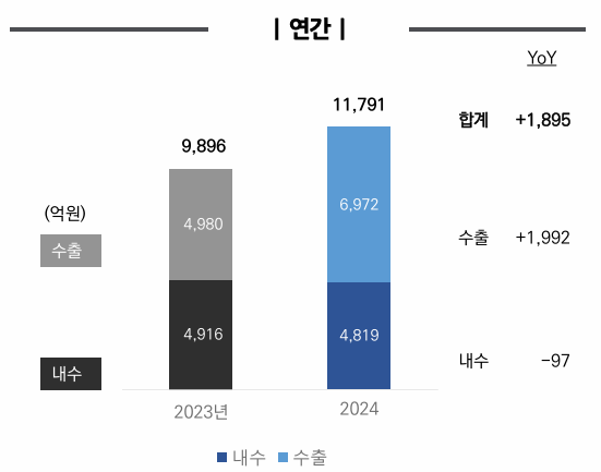 방산부문의 경우 지난해 매출 대비 789억원 증가한 1조2,580억원을 목표로 정했다. 지난해 매출 호조에 크게 기여한 수출의 경우 1,415억원 만큼 목표 매출액을 축소한 반면, 내수 목표 매출은 2,204억원 증액하며 2025년 풍산 방산 부문은 내수 시장에 좀 더 집중할 것임을 암시했다. 그러면서 대구경탄 수요가 확대되는 상황에 맞게 대구경탄 수주를 추가 추진하고, 생산을 확대할 방침이라고 전했다.