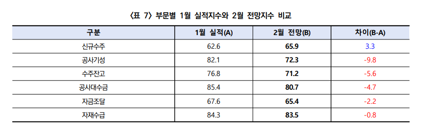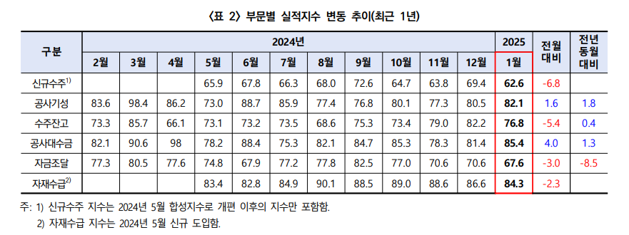 부분별 지수를 살펴보면 1월 신규수주지수는 62.2으로 전월 대비 6.8p 하락하며 주요 지수 가운데 최대 낙폭을 기록했다. 이 밖에 수주잔고(-5.4p)와 자금조달(-3.0p), 자재수급(-2.3p)에서 하락한 반면 공사기성(+1.6p)과 공사대수금(+4.0p)은 상승했다.