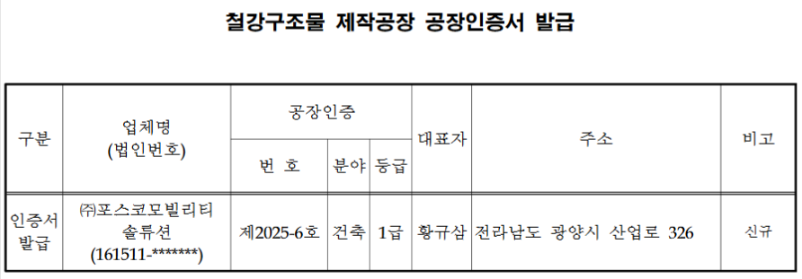 포스코모빌리티솔루션, 철강구조물 제작공장 1급 인증서 획득