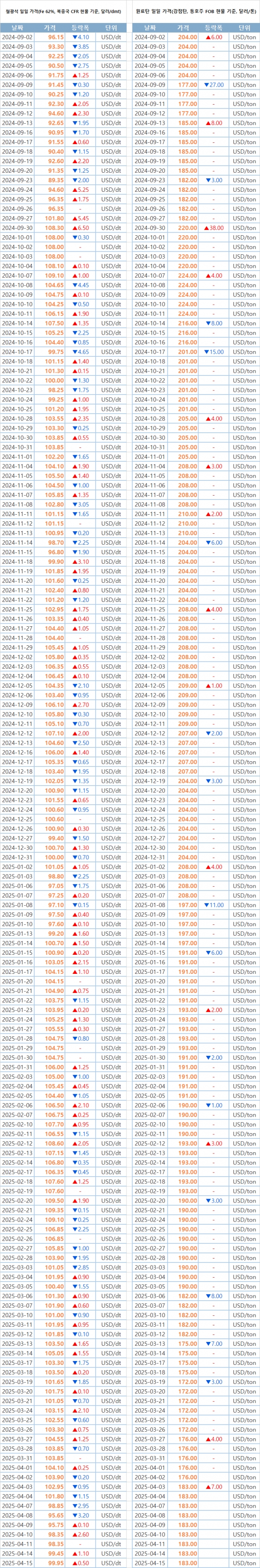 [표] 일일 철강 원료 가격 동향(4월 15일)