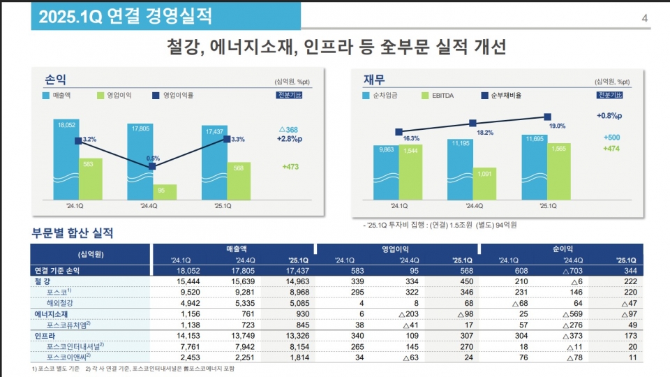 포스코홀딩스는 24일 기업설명회를 통해 올해 1분기 철강과 에너지소재, 인프라 등 전 사업 부문에서 실적 개선을 이뤄냈다고 밝혔다. 박재철 기자 parkjc@snmnews.com 다른 기사 보기 관련기사 포스코, 국내 철스크랩 사업권 회수…2030년 920만톤 확보 목표 포스코홀딩스 中STS 사업장 ‘PZSS’, 중국 안전생산표준화 1급 획득 ‘불길 속 의인’ 4명, 포스코히어로즈로…이웃을 구한 평범한 영웅들 포스코 사보 ‘쇳물’ 창간호 71년 만에 세상 밖으로..철강협회, 史料 공모 사업 [포스코홀딩스IR] 포스코그룹-현대차그룹, 철강·이차전지 분야 상호 MOU체결 [포스코홀딩스IR] 저수익사업과 비핵심자산 등 구조개편 진행 [포스코홀딩스IR] 올해 8.8조원 투자 계획으로 속도 조절 속 핵심 사업 투자 지속 [포스코홀딩스IR] 1분기 판매량 감소에도 비용 감소로 영업益 증가 [포스코홀딩스IR] 인도 법인의 지속적 실적 개선과 중국 장가항 적자 축소 포스코홀딩스, 2025년 1Q 실적 컨퍼런스콜 주요 질의응답 (Q&A) 저작권자 © 철강금속신문 무단전재 및 재배포 금지