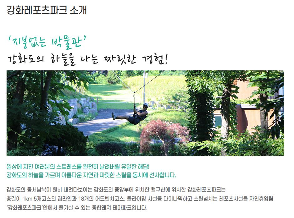 강화레포츠파크는 집라인, 어드벤처, 서바이벌 등 다양한 레포츠 시설과 10만평 규모의 휴양림으로 조성된 종합레저 테마파크로 2018년 개장했다.