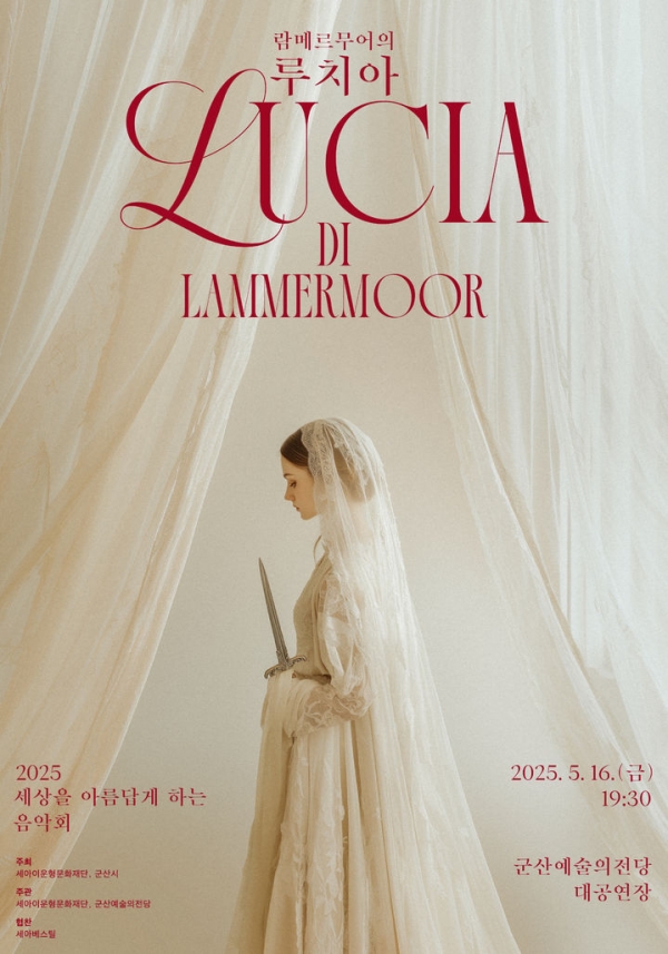 군산예술의전당이 ‘세아이운형문화재단’과 공동기획으로 오는 5월 16일 저녁 7시 30분 대공연장에서 ‘세상을 아름답게 하는 음악회’ 오페라 ‘람메르무어의 루치아’ 공연을 올린다.