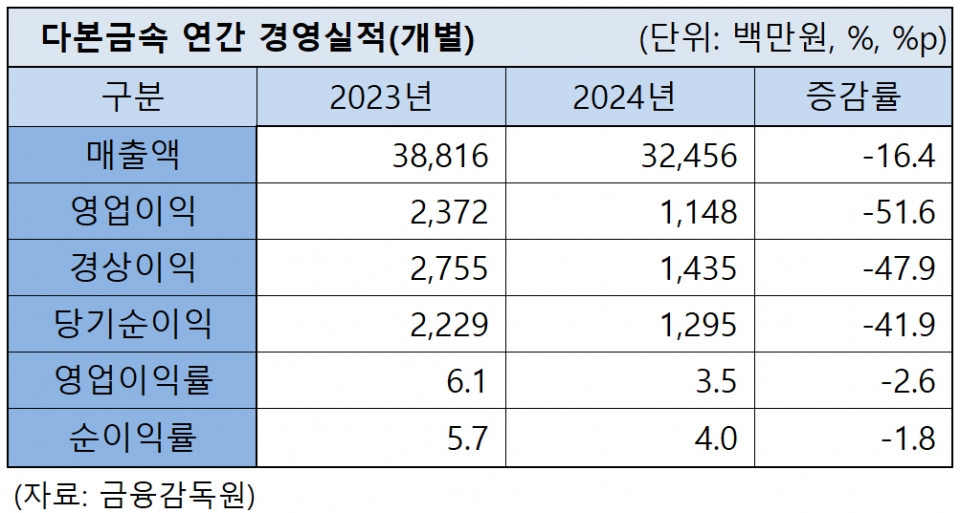다본금속은 지난해 경영실적으로 영업이익 11억 원, 순이익 13억 원을 기록했다. 전년보단 각각 51.6%, 41.9% 급감했지만 동종 업계가 수요 부진 등 영향으로 대규모 실적 악화를 기록한 점에 비해 흑자 유지를 달성하는 성과를 거뒀다.