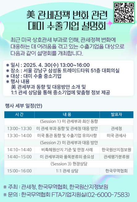 30일, 관세청은 서울 트레이드타워 51층 대회의실에서 한국무역협회 자유무역협정(FTA)·통상 종합지원센터, 한국원산지정보원 등과 함께 ‘미 관세정책 변화 관련 대비 수출기업 설명회’를 개최했다.