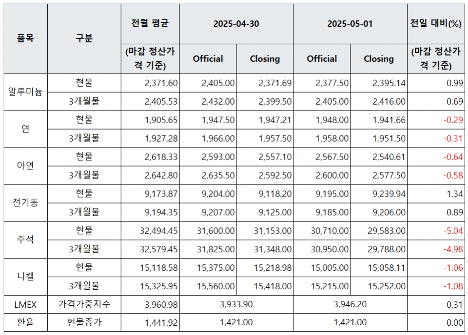 [표] LME 비철금속 및 환율 동향(5월 1일)