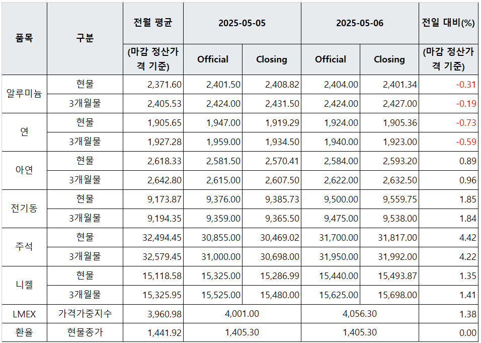 [표] LME 비철금속 및 환율 동향(5월 6일)