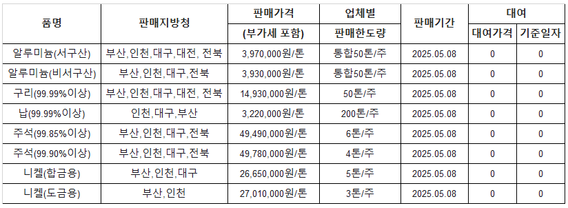 [표] 조달청 방출 가격(5월 8일)