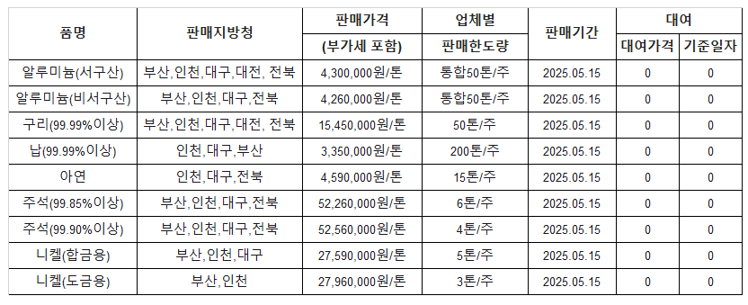 [표] 조달청 방출 가격(5월 15일)