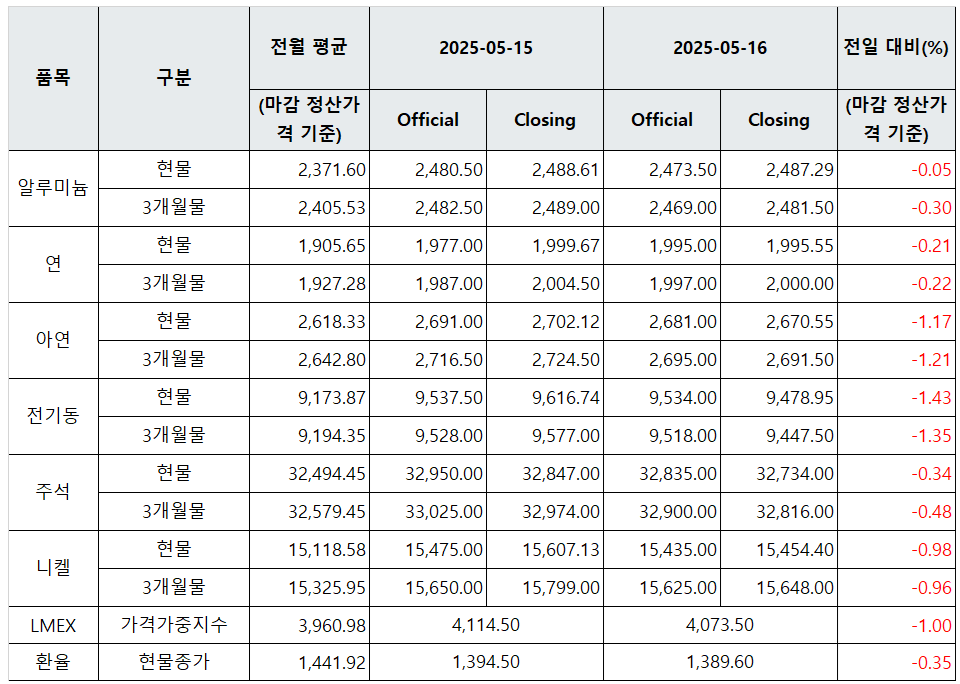 [표] LME 비철금속 및 환율 동향(5월 16일)