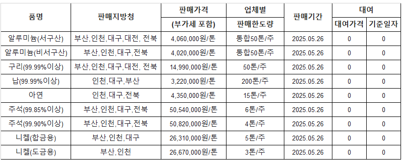 [표] 조달청 방출 가격(5월 26일)
