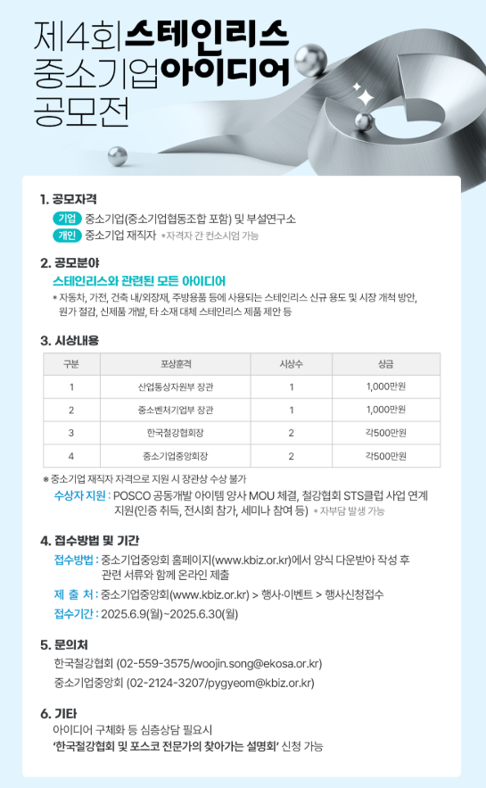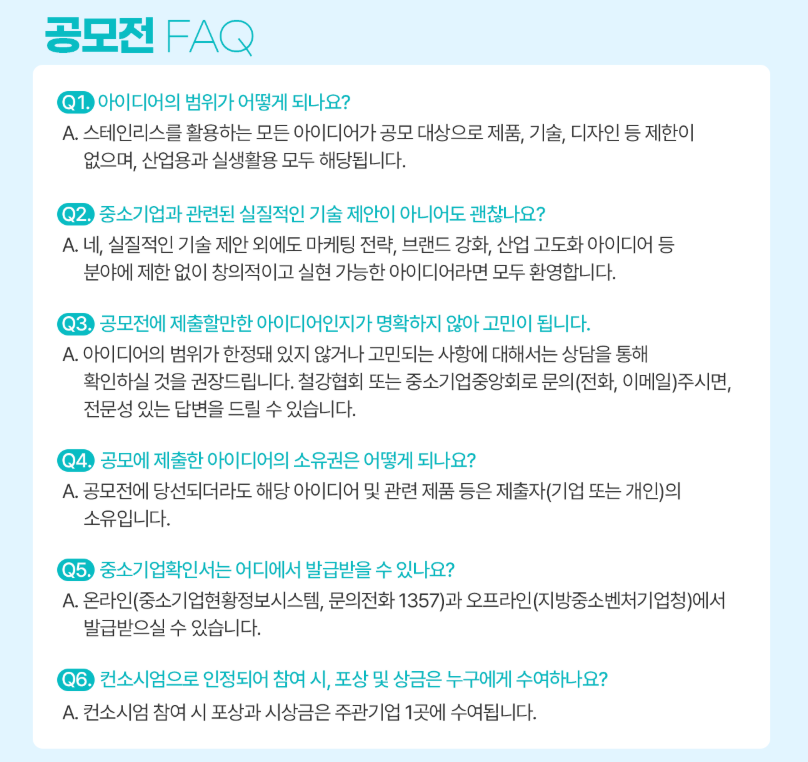 이번 4회차 공모전은 이전과 같이, 중기중앙회 홈페이지 내 전용 공간(https://www.kbiz.or.kr/ko/cscm/event2/view.do?mnSeq=1741&seq=6663&pg=1&pgSz=9)을 통해 상세 안내와 아이디어 공모 접수를 진행한다. 공모전에 제출할 아이디어의 범위 또는 참여에 있어 모호한 부문이 있다고 생각하는 경우 철강협회(02-559-3575/woojin.song@ekosa.or.kr) 또는 중소기업중앙회(02-2124-3207/pygyeom@kbiz.or.kr)에 문의하면 관련 전문가가 답변할 예정이다.