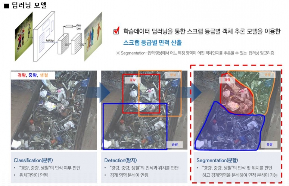 AI 검수 시스템은 철스크랩 입고 차량이 반입될 때 AI 카메라가 적재된 철스크랩의 하화 장면을 모니터링하면서 자동으로 철스크랩의 등급과 비율을 분석해 입고 차량의 등급 판정을 진행한다. 또한 폭발성 물질이나 밀폐 용기 등 위험물 역시 실시간으로 탐지한다.