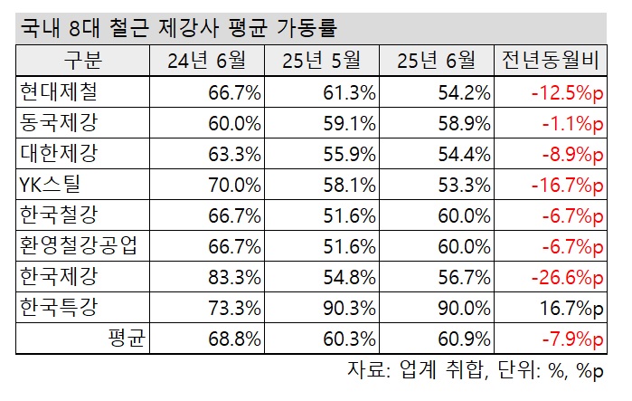 업계에 따르면 △현대제철 △동국제강 △대한제강 △YK스틸 △한국철강 △환영철강공업 △한국제강 △한국특강 등 국내 8대 철근 제강사 월별 생산 계획을 집계한 결과, 6월 가동률은 평균 60.9%로 전년 동월(68.8%) 대비 7.9% 포인트(p) 하락한 것으로 나타났다.