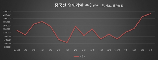 철강협회 통계에 따르면 5월 중국산 열연광폭강대 수입은 21만7,442톤으로 전월 대비 7.9%, 전년 동월 대비 47.9% 증가했다. 일본산은 10만1,100톤을 기록해 3개월 만에 10만 톤대를 다시 넘어섰고, 전체 열연 수입은 31만9,784톤에 달했다. 월간 수입은 2023년 8월 32만5,000톤 이후 가장 많은 수치다.
